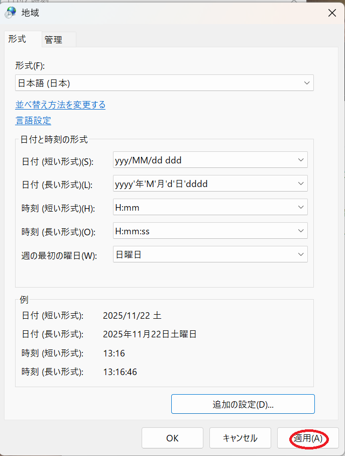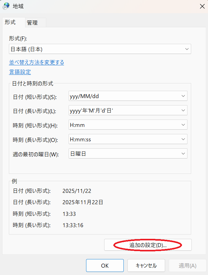 「形式」が表示されますので、「追加の設定」をクリックします。