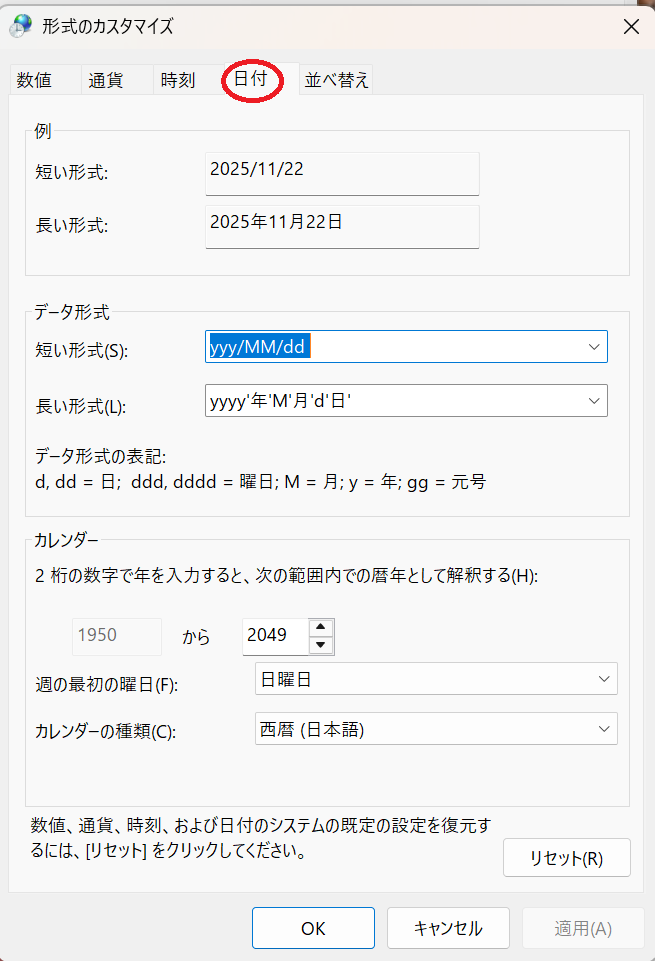 形式のカスタマイズが表示されますので、タブを「日付」にします。