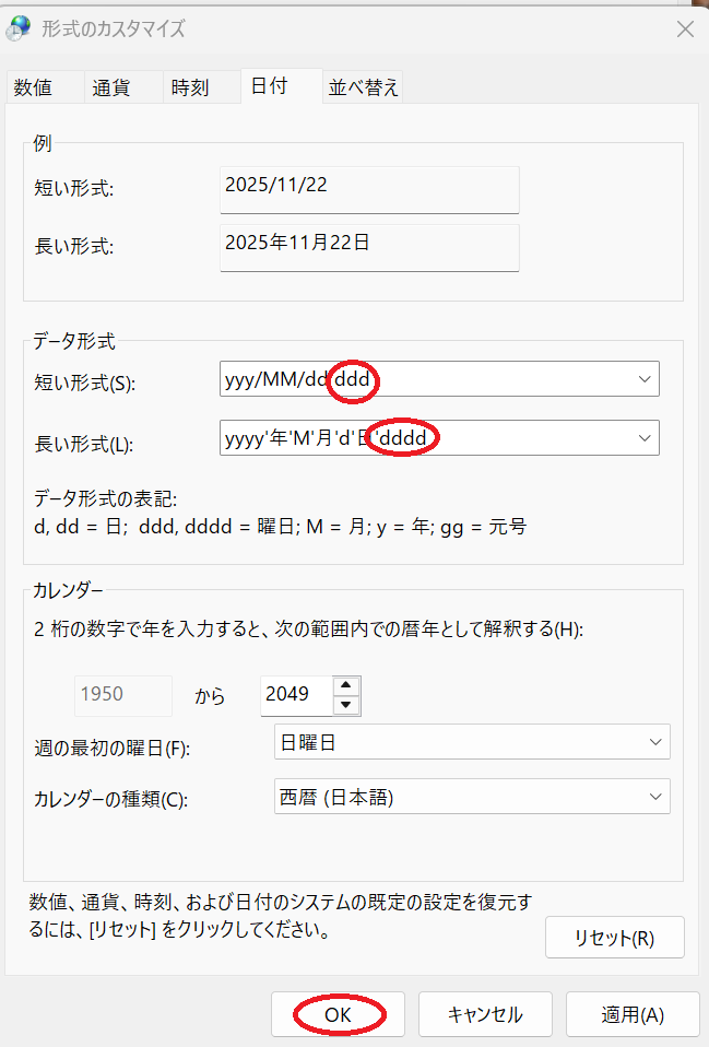 データ形式に、曜日の表記である「ddd」「dddd」を入力したら「OK」をクリックします。