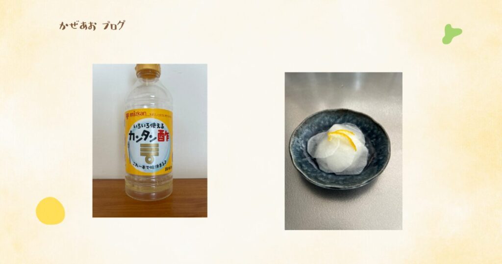- 分量目安:大根1本| いろいろ使えるカンタン酢適量| ゆず4分の1程度