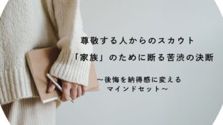 仕事 仕事のスカウトを「家族」のために断念したあなたへ┃癒えない心に向き合う方法 尊敬する人のスカウトを家族の事情で断った葛藤。後悔せず「自分の選択」を正解にするマインドを伝えます。 2026.01.21 仕事