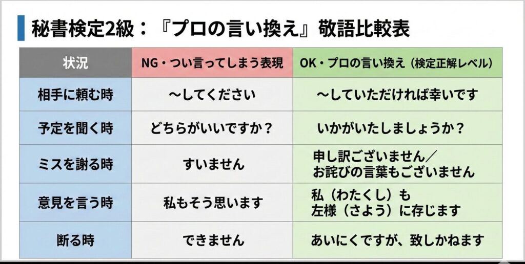 2級では、教科書通りの敬語から一歩進んだ「大人の言い換え」が問われます。
