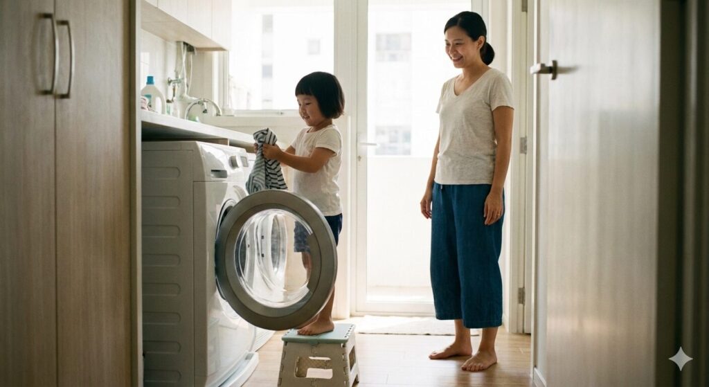 - 3歳(仕分け担当): 「靴下を同じ柄でペアにする」「洗濯カゴに脱いだ服を入れる」。これは「パターン認識」という知育教育でもあります。